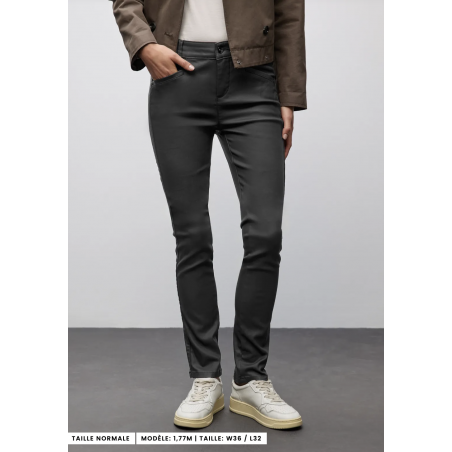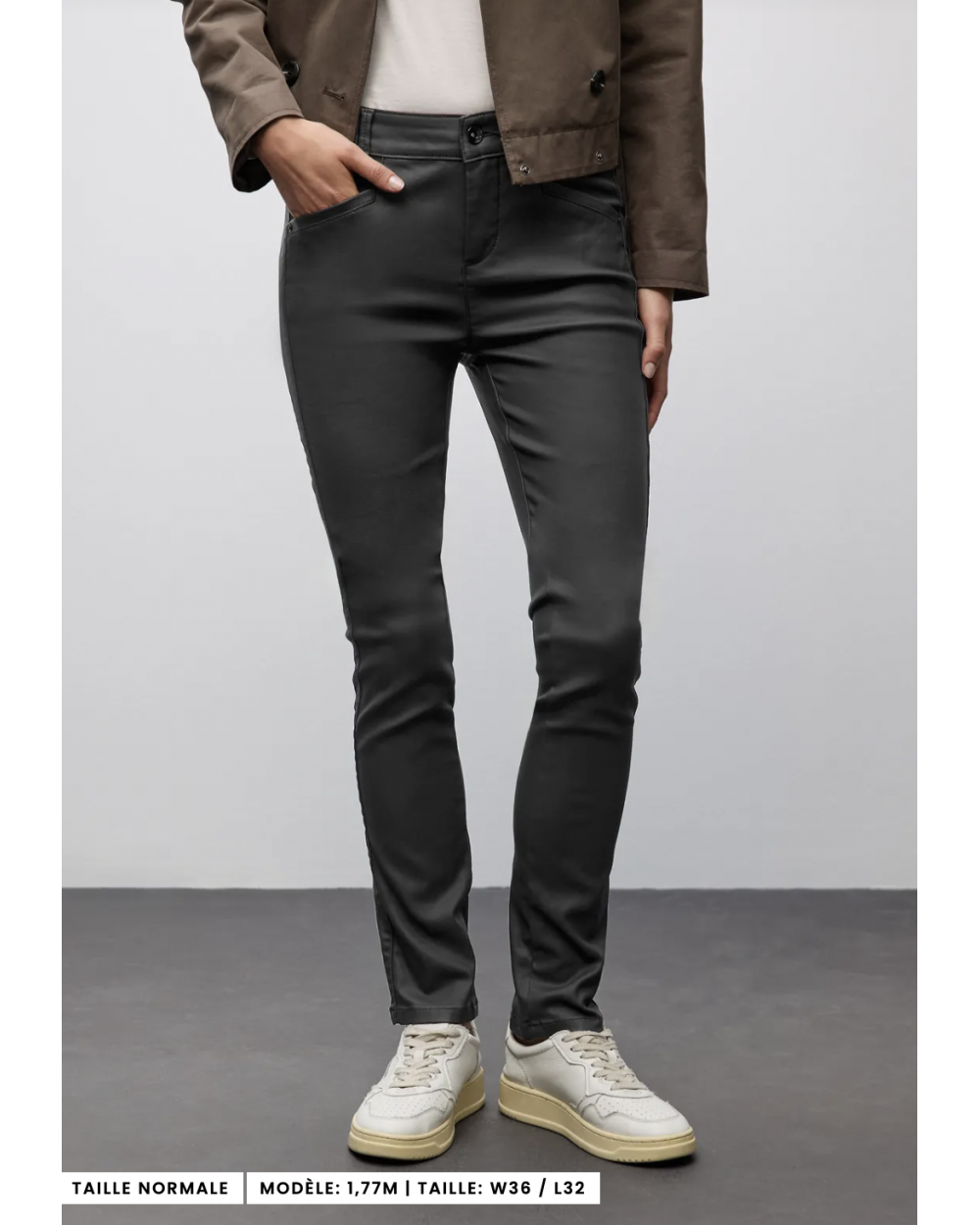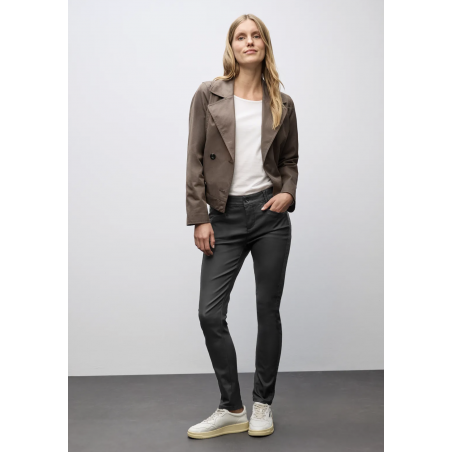 Le pantalon enduit Style York de Street One pour femmes marque des points avec sa coupe slim. La taille Mid Waist et les Slim Legs soulignent la silhouette, tandis que le mélange de matières avec une part de stretch garantit un grand confort.