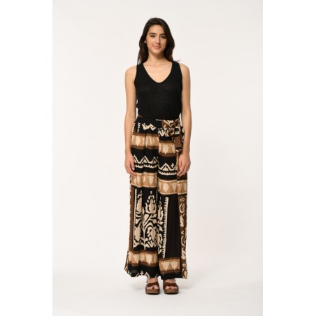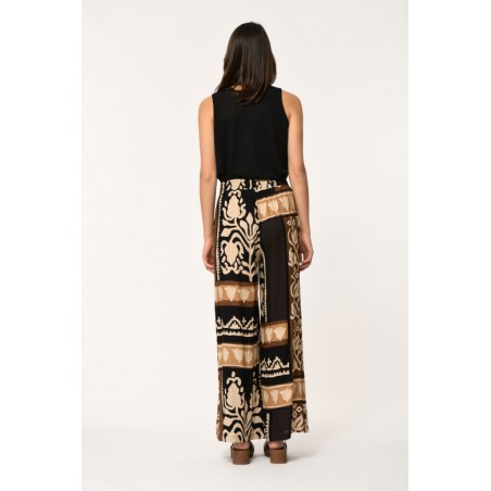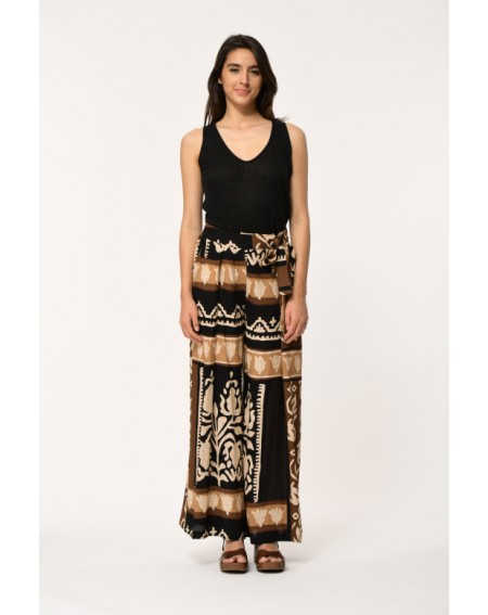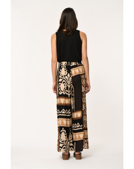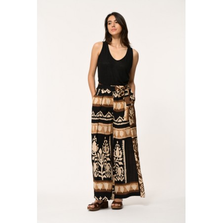 PANTALON FLUIDE IMPRIME ETHNIQUE, TAILLE HAUTE, COUPE LARGE, CEINTURE AVEC LIENS A NOUER, CEINTURE DOS ELASTIQUEE, POCHES ITALIENNES, JEU DE PLIS SUR LE DEVANT