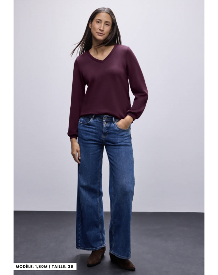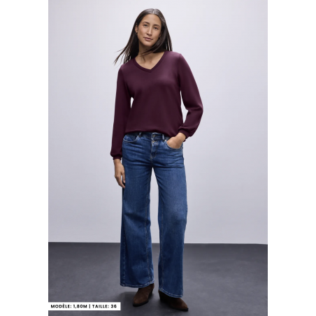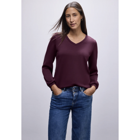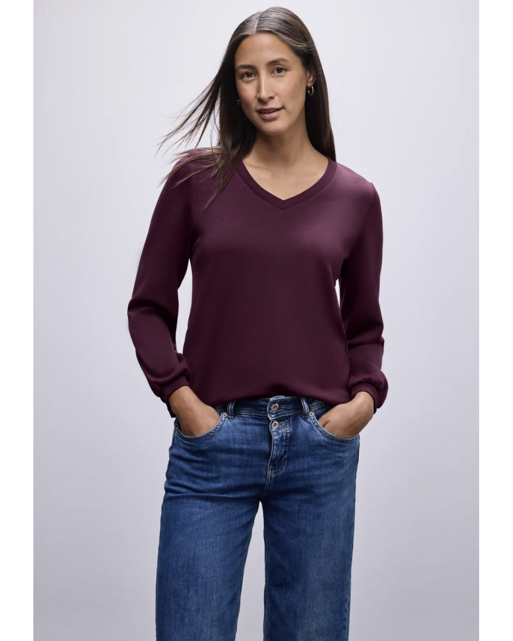 Avec sa brillance soyeuse et son élégance féminine, ce t-shirt à manches longues de Street One pour femmes marque des points dans tous les looks. Le doux mélange de modal avec une part de stretch assure un agréable confort, tandis que l'encolure en V complète le look avec style. Idéal pour les tenues décontractées raffinées.