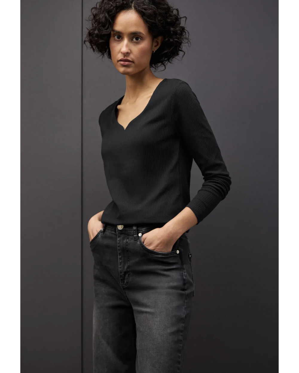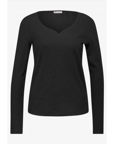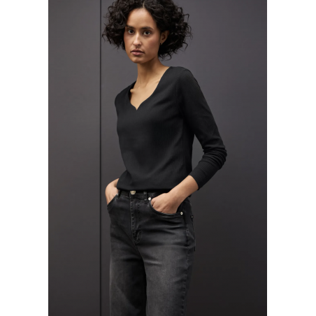 Le t-shirt à manches longues de Street One pour femmes séduit par sa structure côtelée féminine et son charmant décolleté en forme de cœur. La qualité douce du coton avec une part de stretch t'offre un confort agréable et fait de ce t-shirt un allrounder polyvalent pour le quotidien et le bureau. Idéal pour les looks qui soulignent la silhouette - combine-le de manière décontractée avec un jean ou de manière élégante avec un blazer.