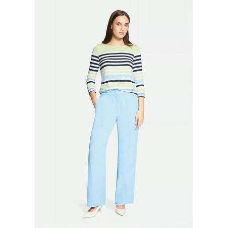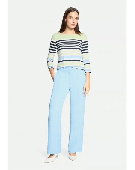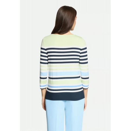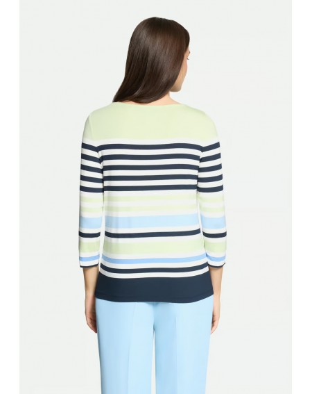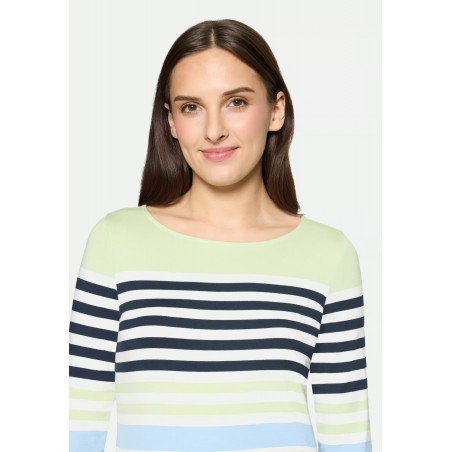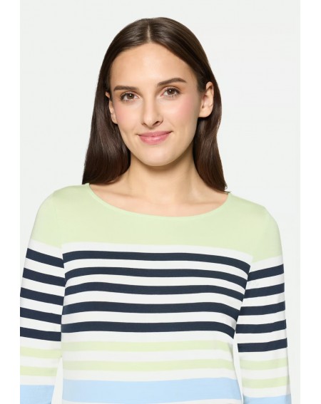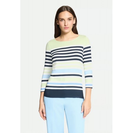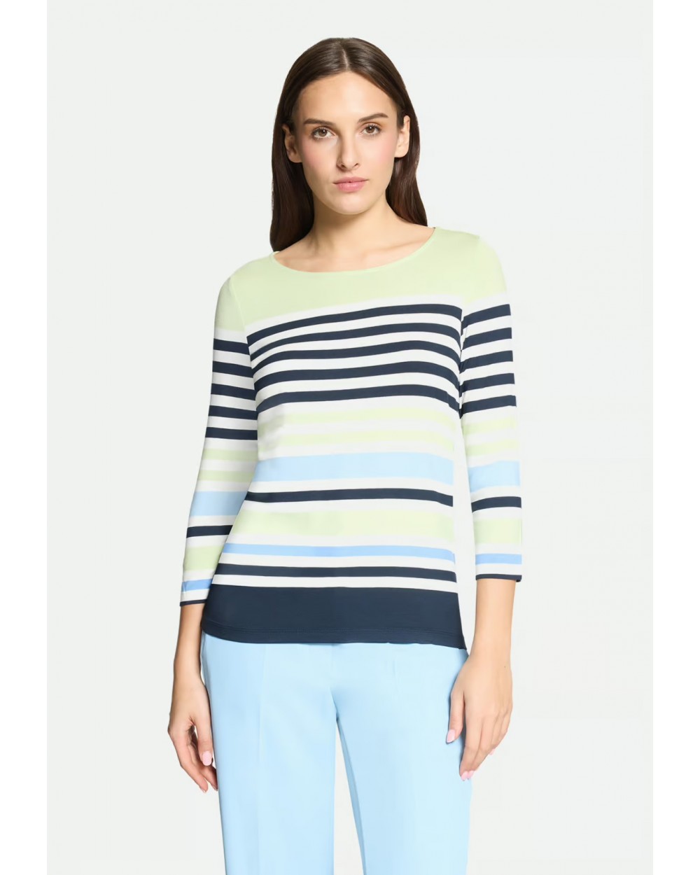 Un t-shirt basique ajusté, mi-long, à encolure bateau élégante. Les rayures apportent une touche de dynamisme, tandis que l'absence de fermeture assure un confort féminin et sans artifice.